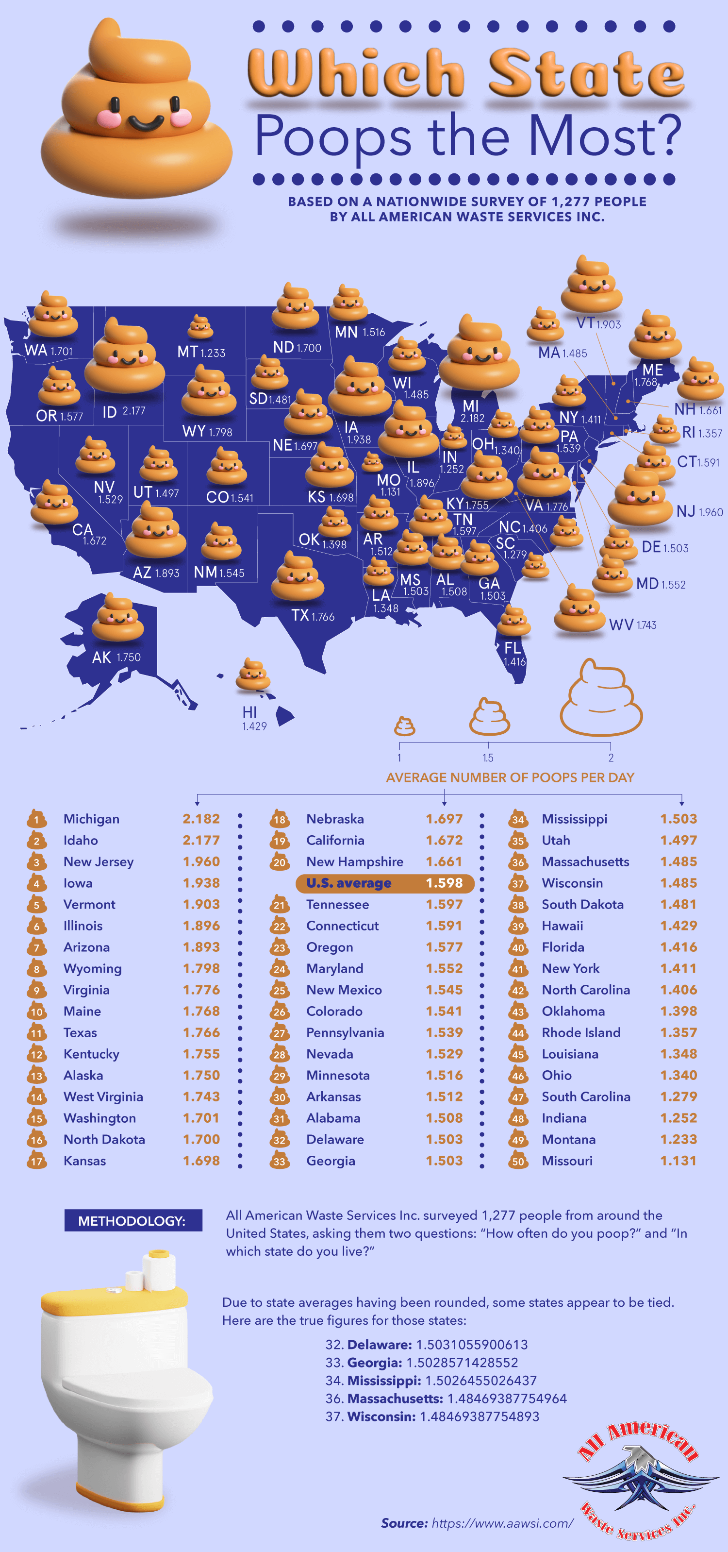 The AAWSI team surveyed 1,277 people from around the United States, asking them two questions: “How often do you poop?” and “In which state do you live?”, to determine which state's residents are visiting the porcelain throne the most often. Explore our map of adorable dookies below to see which U.S. state came out on top of the pile with the highest average number of poops each day.